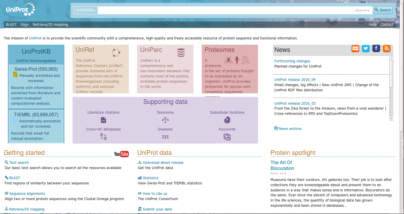 UniProt is a comprehensive, high-quality and freely accessible database of protein sequence and functional information, many entries being derived from genome sequencing projects. It contains a large amount of information about the biological function of proteins derived from the research literature. UniProt Knowledgebase (UniProtKB) is a protein database partially curated by experts, consisting of two sections: UniProtKB/Swiss-Prot (containing reviewed, manually annotated entries) and UniProtKB/TrEMBL (containing unreviewed, automatically annotated entries). As of 19 March 2014, release "2014_03" of UniProtKB/Swiss-Prot contains 542,782 sequence entries (comprising 193,019,802 amino acids abstracted from 226,896 references) and release "2014_03" of UniProtKB/TrEMBL contains 54,247,468 sequence entries (comprising 17,207,833,179 amino acids).