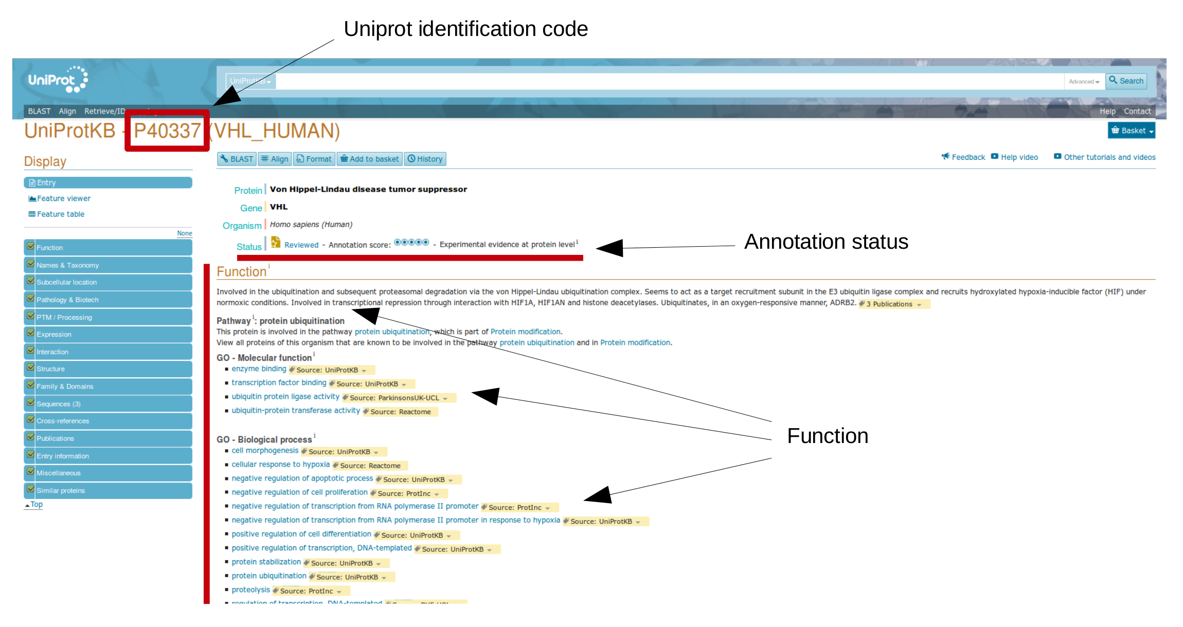 Now, try to open one "entry", for instance P40337 (Human von Hippel-Lindau protein).